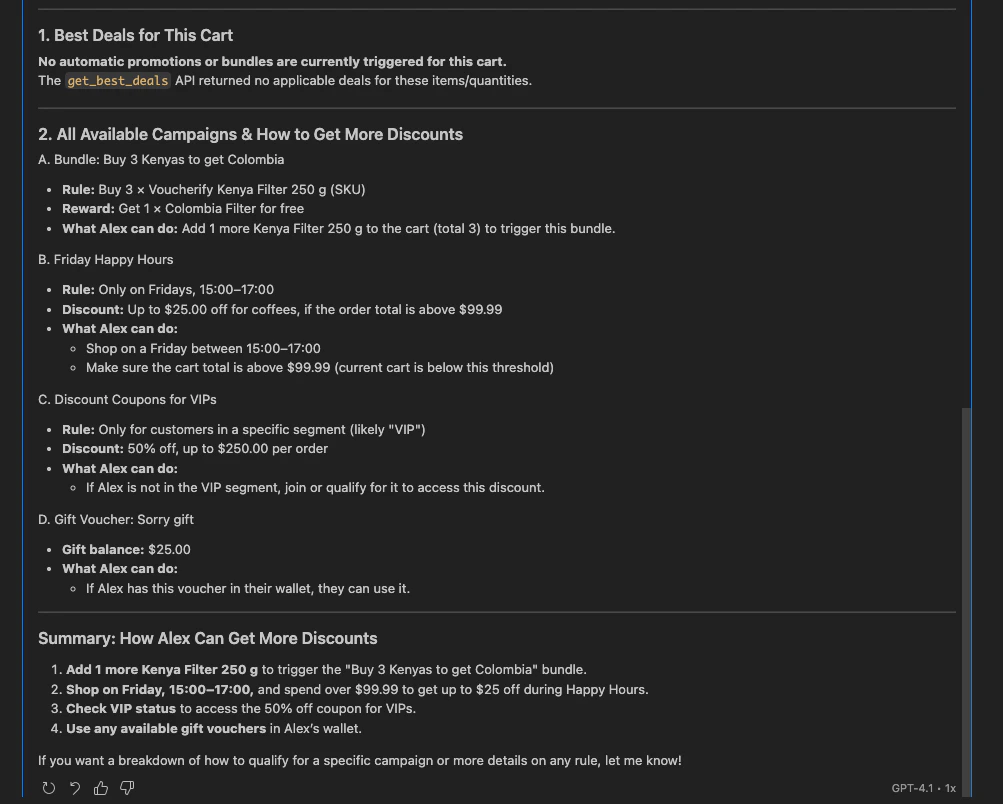 In this scenario, the user wants to learn what best deals a customer, Alex Doe, can get if they have a specific cart. The scenario used is get_best_deals. The Voucherify Core MCP ran 9 API calls to find out what best deals Alex Doe can get at the moment and what they’ll get if they meet specific conditions. In this case, one prompt was enough to propose best deals for Alex Doe, like: