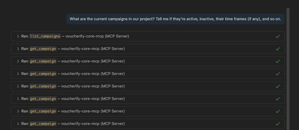 In this scenario, the user wants to learn what Voucherify campaigns there are in the project and if they’re active, have time frames set, and similar details. . This gives a quick overview of needed info about campaigns. The Voucherify Core MCP runs 8 API calls to fetch the requested data. The MCP returned campaign details and summarized the campaigns by their type, status, and provided time frames. For example, the response shows: